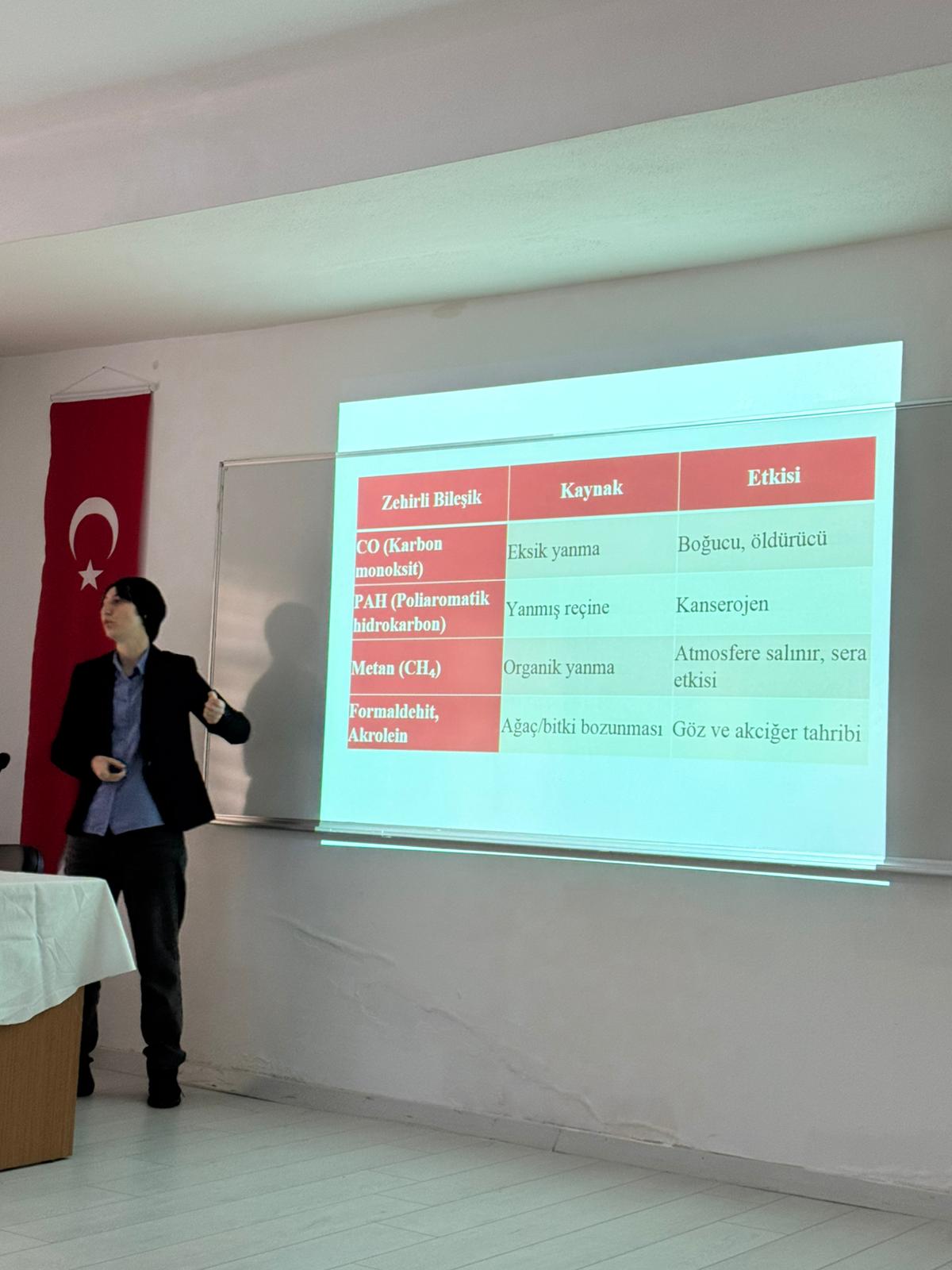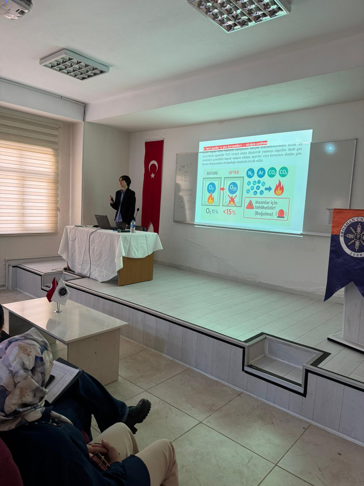 Doç. Dr. Yeliz Demir sunumunda, kimyanın yanma süreçlerindeki rolünü ve yangın oluşumunun bilimsel temellerini katılımcılarla paylaştı. “Kimyasal olarak yanma nedir, hangi koşullarda gerçekleşir?” sorusundan yola çıkarak başlayan konuşmada; farklı maddelerin ısıya verdiği tepkiler, enerji dönüşümleri, kıvılcımların büyük yangınlara dönüşme mekanizması ve yangın güvenliği konuları detaylı biçimde ele alındı. Seminerde ayrıca, kimyanın yangın söndürme tekniklerine katkısı, modern güvenlik uygulamaları ve laboratuvar güvenliği açısından kimyasal bilincin önemi vurgulandı.