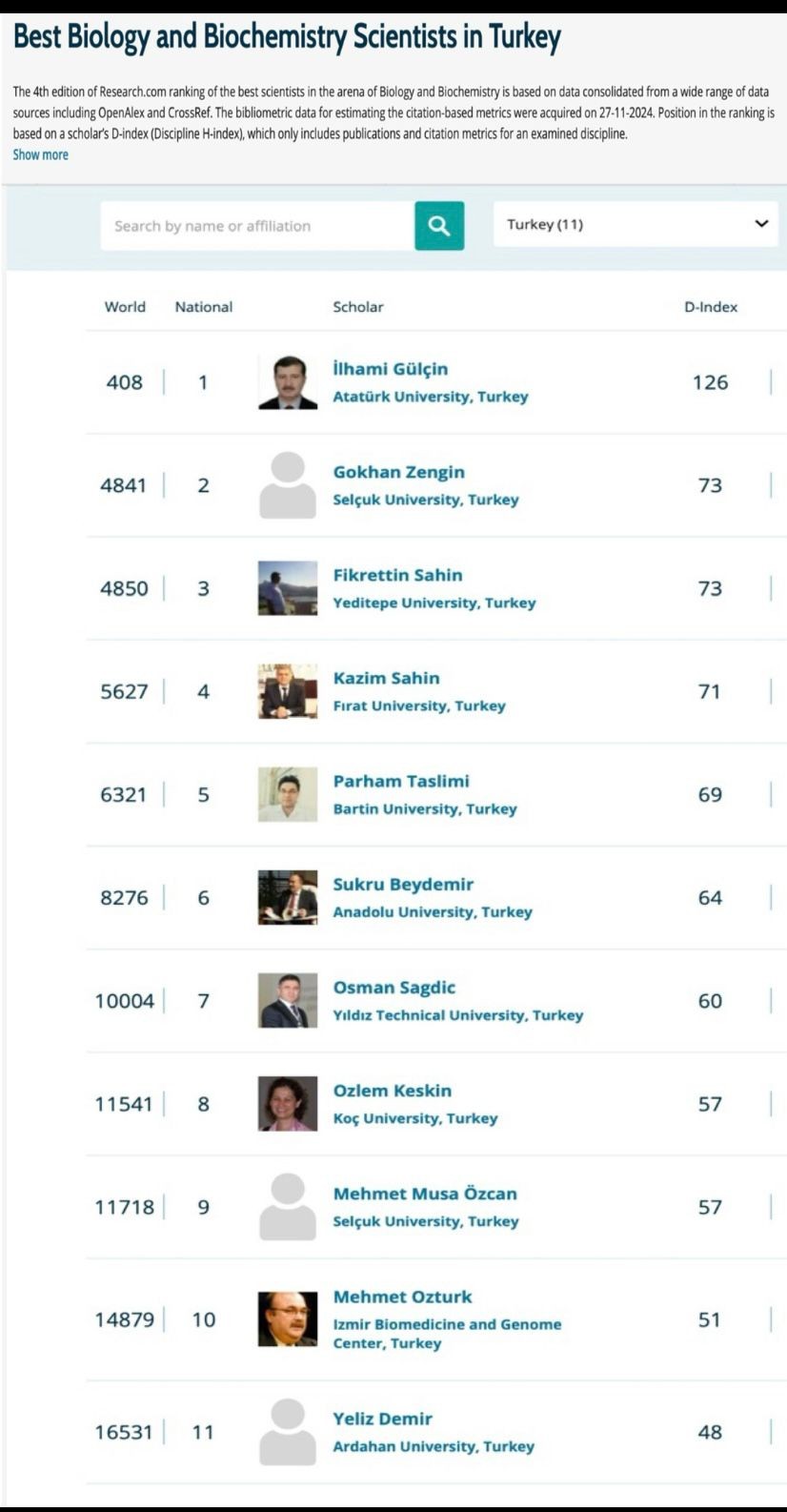 Research.com internet sitesi tarafından yayımlanan dünyada biyoloji ve biyokimya alanındaki en iyi bilim insanları sıralamasının 4. versiyonu açıklandı. 97.419 araştırmacı arasından yapılan değerlendirme sonucunda, Türkiye’den yalnızca 11 bilim insanı bu prestijli listede yer alma başarısı gösterdi. Bu seçkin listede yer alan akademisyenimizi tebrik ediyor, başarılarının devamını diliyoruz.